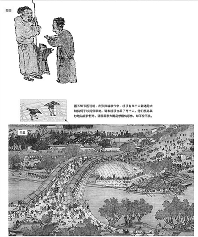 《清明上河圖》在后世有兩種重要的仿本,一個是明代仇英款仿本,一個是清院本。在本文結(jié)束之前,我要以清院本中的虹橋為例,來說明仿本與張擇端原作的一個重要差別。請看圖五,那就是清院本中的虹橋,那橋梁雄偉壯大,氣勢如虹,是吧?再看船與橋的關(guān)系,船很大,但桅桿早就放下來,完全可以順利通過。再看那些人物,他們小小的,就像螞蟻。他們像螞蟻,不是因為我們把圖縮得小,實際上,即使放大,也無法看出他們的個性、情緒,換句話說,這些人與其說是人,不如說是一些符號。把人符號化與賦予人物個性,這是仿本與原作的極大區(qū)別,也是我極力推崇原作的原因所在?!肚迕魃虾訄D》,我們就看到這里。(文并供圖/田玉彬)
