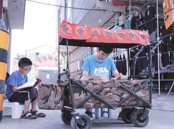 頭上戴著斗笠,臉上掛著靦腆的笑,推著裝滿課外書的迷彩小推車,趕往外婆家附近的集市擺攤。最近,14歲少年王子悅開辦“流動圖書館”的視頻感動了很多網友。