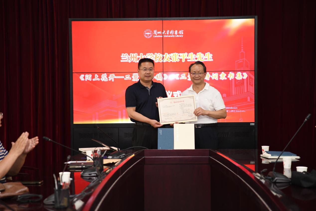 蘭州大學(xué)圖書(shū)館及直屬單位黨委書(shū)記王偉國(guó)向張平生頒發(fā)收藏證書(shū)