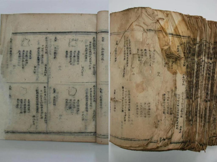 2021年,安徽省圖書館修復的徽州休寧《魚鱗圖冊》(明萬歷木活字印本)修復前后對比圖。(安徽省圖書館供圖)