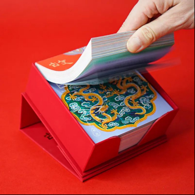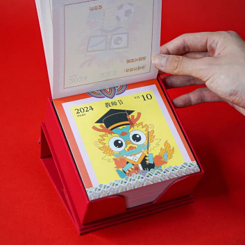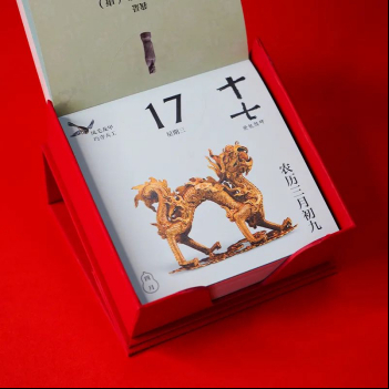 如意取出第一層里紅紅的燙金書刊盒,馬上發(fā)現了它的小機關:原來盒蓋上有個吸鐵石,把它翻過來,就可以25度傾斜地放在書桌上,舒服地翻閱一整年的“日子”;每一天的頁面都能被絲滑地撕下,作為小書簽,插在課本讀物中。