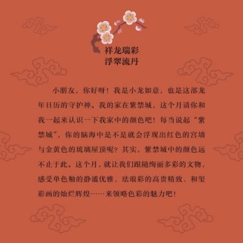 媽媽告訴如意,這是一個“時光寶盒”,里面有來自故宮不同領域的10位專家從故宮館藏中精選的262件“龍”文物,它們每天登場介紹自己的故事,還會請小讀者幫忙,每日動手給日歷中的小龍如意卷軸貼出一身漂亮的龍鱗。