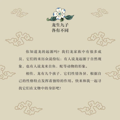 從2月到12月,如意更發(fā)現了“龍生九子”的故事,原來,在鐘鈕上的龍子叫“蒲牢”,在宮門上的龍子叫“椒圖”……在古老的龍家族中,有把身子彎成S形的螭龍,有在空中振翅飛舞的應龍,還有拱起身子趴在壺上的蟠龍……精選的故宮官式建筑上的和璽彩畫、大氣精美的九龍壁和千龍吐水的螭首奇觀,都讓如意著迷而向往。