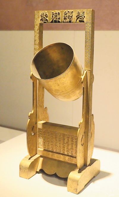 一件造型獨(dú)特的金色器物吸引了記者注意。達(dá)微佳介紹,這是故宮博物院藏清代銅鍍金欹器。欹器是一種傾斜易覆的盛水器,中空時(shí),會(huì)向一側(cè)傾斜;注水一半時(shí),能保持端正;水注滿時(shí),會(huì)傾覆倒出,生動(dòng)展現(xiàn)了儒家“不偏不倚,無(wú)過(guò)不及”的中庸之道。據(jù)文獻(xiàn)記載,孔子曾在魯桓公之廟觀欹器,并向?qū)W生講解它的道理。古時(shí)國(guó)君將欹器置于座右,作為修身之戒,因此又稱“宥坐之器”。