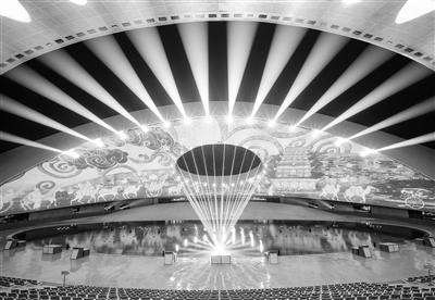 華夏文化展示中心分為展演區(qū)與展示區(qū)兩個部分,展示區(qū)為古鎮(zhèn)式商業(yè)街,目前已進(jìn)入收尾階段,展演區(qū)為大型激光水舞秀劇場——日月館,去年已試運(yùn)營,效果極佳。別名“黃河巨蛋”的日月館總用地面積為12000平方米,場館外形呈半橢圓形,由兩片獨(dú)立的頂棚覆蓋,場館高30米,寬約80米,內(nèi)設(shè)觀眾席位1450座。場館屋頂?shù)奶煅坶_口和場館地面體現(xiàn)了中國天圓地方的理念以及太陽和月亮的互相映襯。外立面采用了與當(dāng)?shù)貍鹘y(tǒng)屋頂瓦片相呼應(yīng)的獨(dú)特形狀,又像鳥兒折疊的翅膀和羽毛,極富活力和寓意。