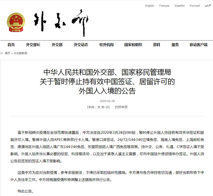 3月26日,中華人民共和國(guó)外交部、國(guó)家移民管理局發(fā)布《關(guān)于暫時(shí)停止持有效中國(guó)簽證、居留許可的外國(guó)人入境的公告》(以下簡(jiǎn)稱(chēng)《公告》),決定28日起,暫時(shí)停止外國(guó)人持目前有效來(lái)華簽證和居留許可入境。