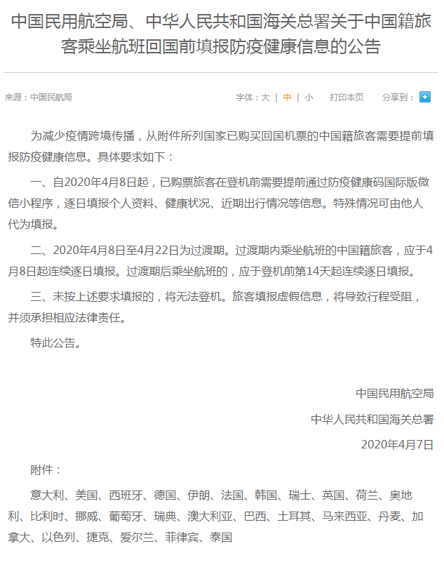 中國民用航空局、中華人民共和國海關(guān)總署4月7日聯(lián)合發(fā)布《關(guān)于中國籍旅客乘坐航班回國前填報防疫健康信息的公告》(以下簡稱《公告》)?!豆妗分赋?,自4月8日起,從意大利、美國、西班牙等26個國家已購買回國機(jī)票的中國籍旅客需要在登機(jī)前提前填報防疫健康信息,包括逐日填報個人資料、健康狀況、近期出行情況等。旅客未按要求填報的,將無法登機(jī);填報虛假信息,將導(dǎo)致行程受阻,并須承擔(dān)相應(yīng)法律責(zé)任。