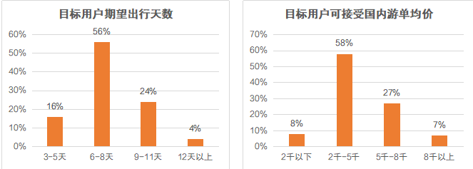 關(guān)于出行方式,一部分客戶表示,“現(xiàn)在機票便宜、酒店也不貴,自己訂也挺方便的”;一部分客戶表示,“想去玩的人應(yīng)該不少,找旅行社安排跟個團,應(yīng)該能省點心”。從整體數(shù)據(jù)來看,選擇自由行/半自助游的客戶占比42%,選擇傳統(tǒng)跟團游和私家定制的客戶總和與之持平,總占比46%。