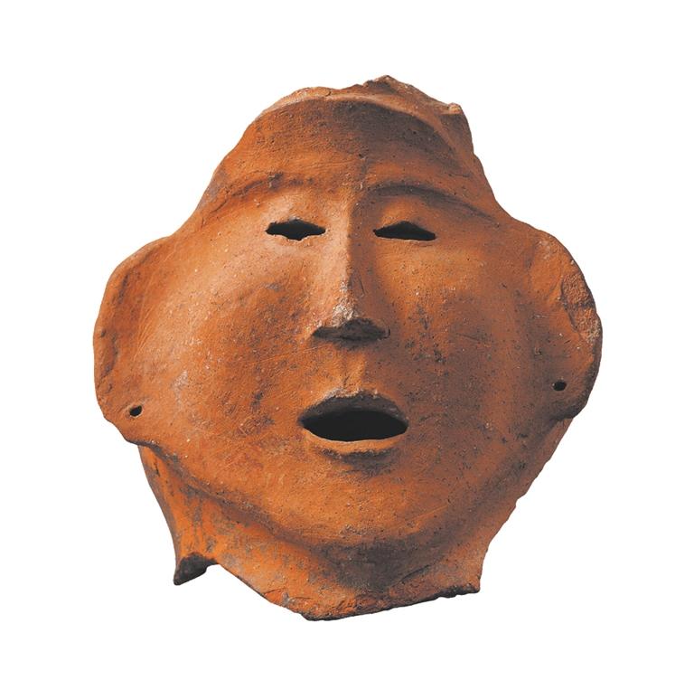這只“紅陶人面”(距今約5200年)高顴闊面,眉骨微隆,表情呆萌憨厚。彩陶器皿不是碗缽,就是瓶盆,總之都是實(shí)用器皿,只不知這只彩陶人面是做什么用的?也許,是史前哪個(gè)小朋友模仿著身邊人的樣子摶著玩的。