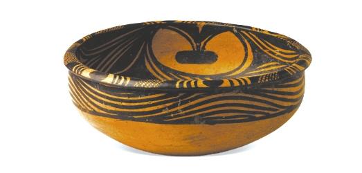 馬家窯文化馬家窯類型(距今約4800年),1966年蘭州市王保保城出土。這是一只工藝精湛,保存完好的彩陶盆,這只旋紋彩陶盆最大的特點(diǎn)是盆內(nèi)壁上繪的三組變體人面紋,同學(xué)們看出這組圖像人面嗎?看懂人面紋需要發(fā)揮想象力,總之,我們的先祖抽象表達(dá)的能力及想象力真令今人景仰!