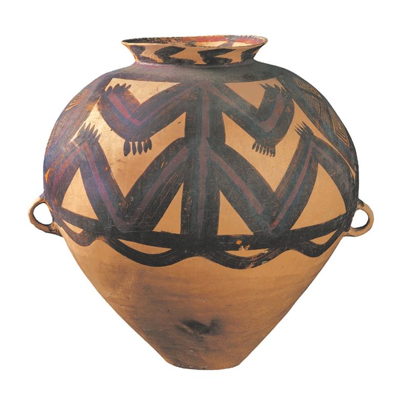馬家窯文化半山類型(距今約 4500 年),廣河縣地巴坪出土。這是雙耳甕器型大氣貴重,施以紅、黑二彩,紅、黑彩交替使用,腹部繪多層連續(xù)垂弧紋和鋸齒紋,黑、紅彩交替使用,由三組分層連續(xù)的垂弧紋組成整體圖案,每層由兩層黑色帶紋和一層紅色帶紋組成,黑色帶紋上緣繪向上的鋸齒紋。整個(gè)圖案密集繁復(fù),俯視猶如一朵盛開的鮮花,造型豐滿,色彩鮮艷。