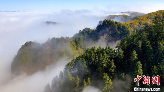 10月上旬,甘肅省定西市漳縣貴清山國家森林公園,朝陽在云層中若隱若現(xiàn),云遮霧繞的景象讓層巒疊嶂的山峰成為“云端村落”,仿若仙境。漳縣貴清山國家森林公園境內(nèi)原始森林遍布,森林、動植物資源十分豐富,貴清山被譽(yù)為隴中的“小華山”,是生態(tài)旅游勝地。