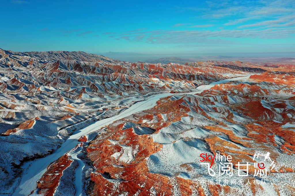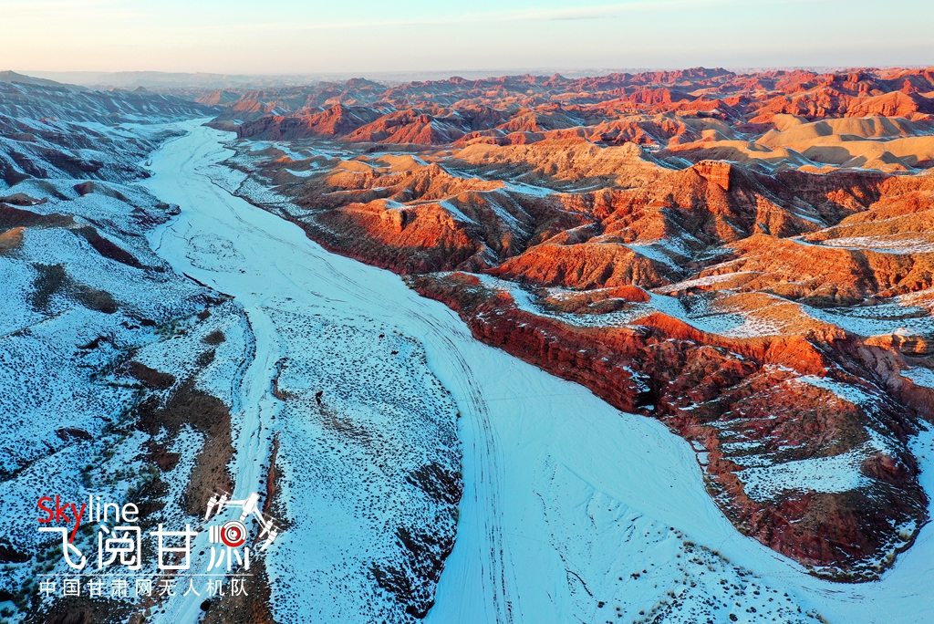 12月15日,雪霽初晴的甘肅省張掖平山湖大峽谷,丹山赤壁與皚皚冰雪交相輝映,分外美麗。(無人機(jī)照片)