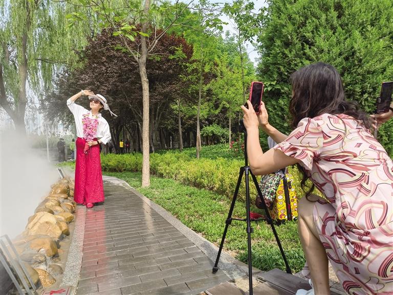 “一枝獨秀”團隊的王大姐和姐妹們帶著專屬攝影師正在這里攝影留念。王大姐告訴記者,這是她們今年第2次來這里打卡。“這里的花真美,每年我們都會來,拍照發(fā)在網(wǎng)上,收獲無數(shù)點贊,心情別提多美了。”說話間,姐妹們又擺了幾個造型,攝影師按下快門,精準(zhǔn)捕捉唯美瞬間。“4公里外的寓言故事園最近也特別火,過兩天我們就去打卡。”王大姐說。
