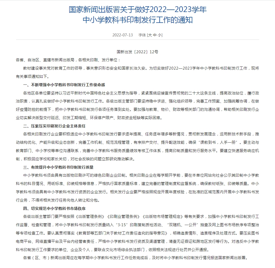 13日,國家新聞出版署網(wǎng)站發(fā)布《國家新聞出版署關(guān)于做好2022—2023學年中小學教科書印制發(fā)行工作的通知》(以下簡稱《通知》)。其中強調(diào),各相關(guān)印刷發(fā)行企業(yè)要積極適應(yīng)中小學教科書印制發(fā)行要求逐年提高、任務(wù)逐年增多等新情況。《通知》的最后表示,要切實規(guī)范中小學教科書市場秩序。