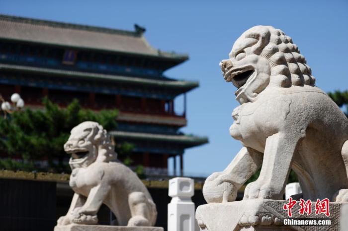 圖為北京正陽(yáng)門箭樓下的石獅雕塑。中新社記者 富田 攝