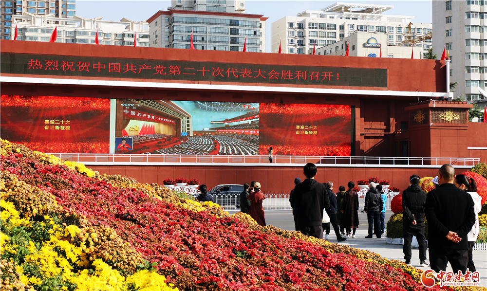 蘭州市東方紅廣場,許多市民駐足路邊,通過大屏幕收看中國共產(chǎn)黨第二十次全國代表大會盛況。