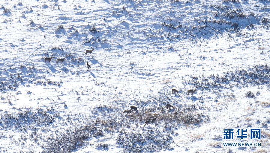 11月12日,一場(chǎng)降雪過(guò)后,祁連山國(guó)家公園甘肅省張掖市民樂(lè)縣境內(nèi)被一層薄薄的白雪覆蓋,成群的野生狍鹿漫步在積雪覆蓋的山坡上。它們時(shí)而追逐玩耍,時(shí)而靜臥休息,時(shí)而覓食充饑,展現(xiàn)出一幅人與自然界和諧共生的畫面。