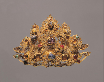 【鑲寶石金帽飾·明代·蘭州出土】帽飾分兩層,底層以極細的金絲盤繞成繁密的渦狀卷草紋;上層中間的金片鏨刻出如意云紋,兩側(cè)各有一金鳳,帽飾上鑲綴各種寶石。