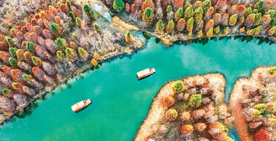 近年來,江蘇省宿遷市宿豫區(qū)大力發(fā)展“農(nóng)旅+產(chǎn)業(yè)+文化”鄉(xiāng)村旅游,圖為宿豫區(qū)新莊彬荷園濕地里,五彩斑斕、錯落有致的紅杉樹與清澈碧綠的河水相互映襯,猶如一幅色彩艷麗的“杉”水畫。陳紅 攝(人民圖片)