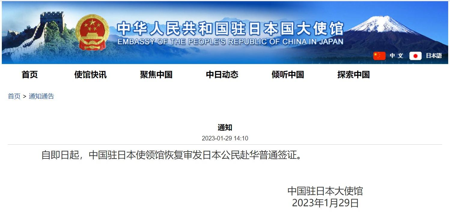 中國駐日本使領(lǐng)館1月29日宣布:自即日起,中國駐日本使領(lǐng)館恢復(fù)審發(fā)日本公民赴華普通簽證。