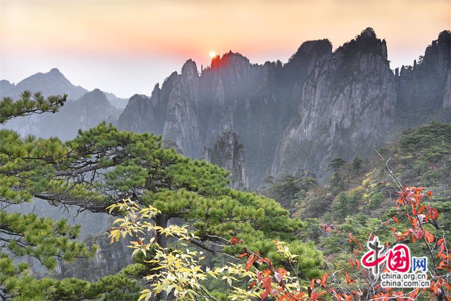 10月15日早晨,黃山風景區(qū)晴空萬里,旭日東升,在火紅的陽照耀下,給本是絢麗多彩的秋色更增加了色彩飽和度,給來山的游客帶來了一場視覺盛宴。