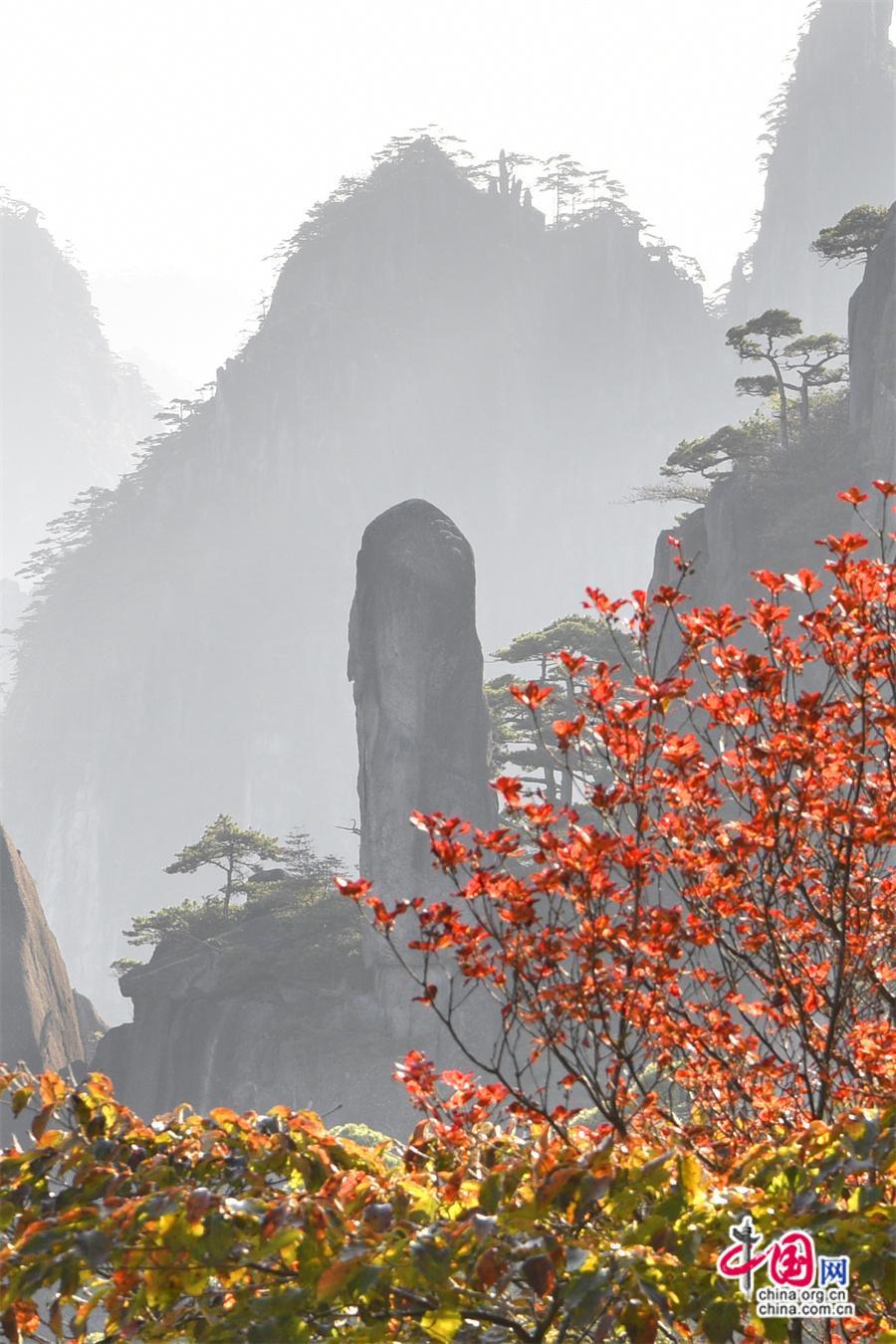 秋日黃山,雨后放晴最為嫵媚。蔚藍色的天空一塵不染,山間綿連不斷的云海,時而像海浪在空中翻滾,擁擠著、碰撞著,時而像一匹白紗綢緞,環(huán)繞在山巔上、飄散在松林間,只見黃山的紅葉點點散落,紅綠相間,與峻峭山峰、藍天云海、奇松怪石,精致婉約地繪成一幅幅五顏六色的山林畫卷,正是登游好時節(jié)。(姚育青)