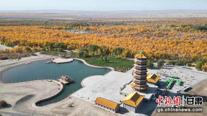 圖為位于金塔南收費站入口前,帶有胡楊和古佛塔元素的“天空之鏡”建筑。(無人機照片) 九美旦增 攝