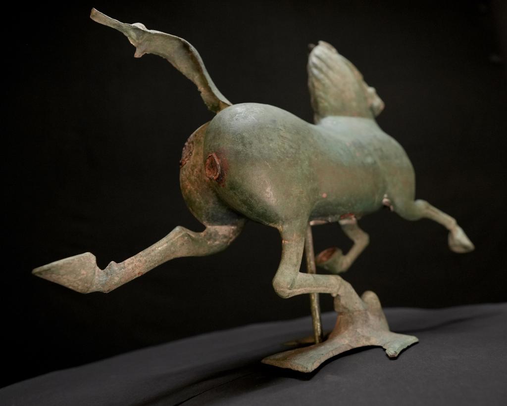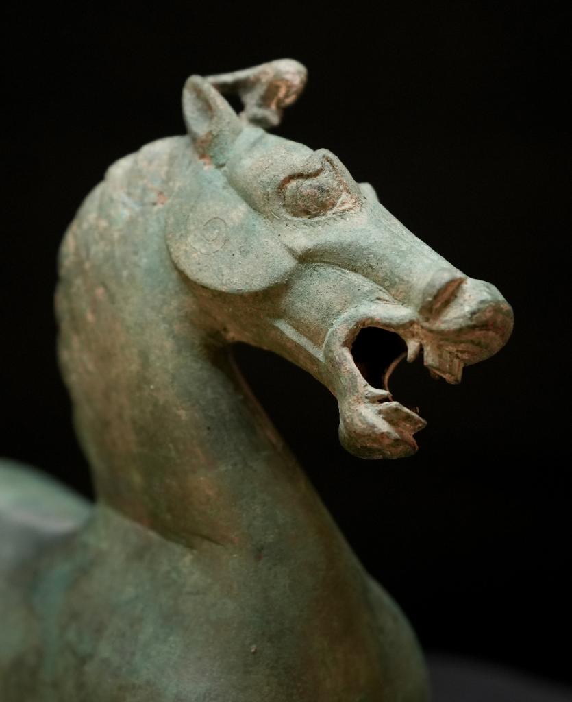 馬兒如在空中飛馳,一足踏上飛鳥(niǎo)的剎那,飛鳥(niǎo)回首驚顧。細(xì)細(xì)觀之,馬的口、眼、鼻均張開(kāi),鬃毛和尾絲后揚(yáng),令人仿若聽(tīng)見(jiàn)馬兒奔騰的嘶鳴和風(fēng)嘯聲,靜態(tài)的青銅器充滿(mǎn)靈動(dòng)之感。