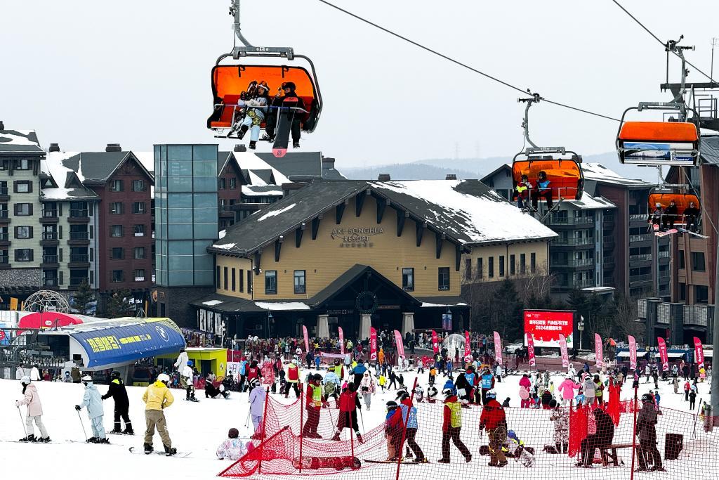 滑雪愛(ài)好者在吉林省吉林市萬(wàn)科松花湖度假區(qū)滑雪。新華社記者許暢 攝