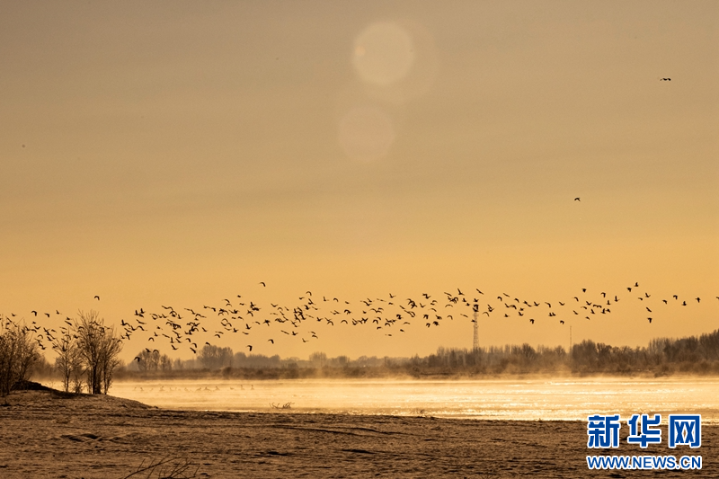 1月21日,冬日清晨,甘肅張掖黑河濕地日出如畫(huà)。一輪冉冉升起的紅日絢麗奪目,與河流、樹(shù)木、候鳥(niǎo)、晨霧共同構(gòu)成了一幅生態(tài)畫(huà)卷。新華網(wǎng)發(fā)(成林 攝)