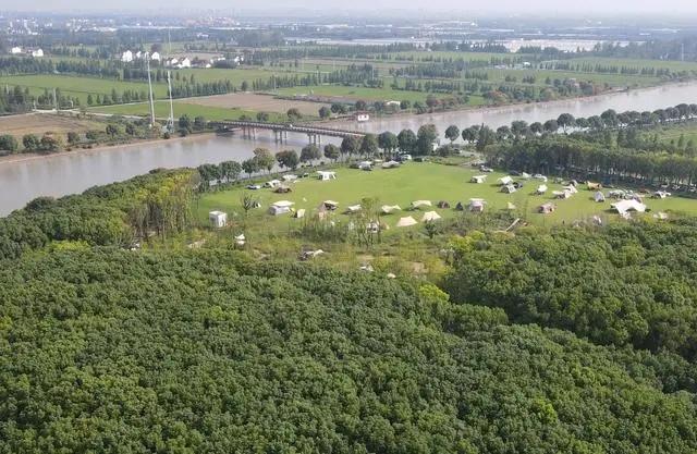 在上海松江區(qū)一處營地,市民游客在河邊草地上搭起帳篷。(2023年9月29日,無人機照片)。新華社記者 方喆攝