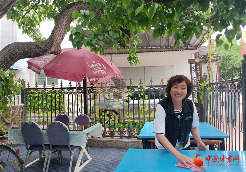 在梨園掩映中,上車村村民彭霞清家的小院安靜美好。進(jìn)入六月,梨園也進(jìn)入一年當(dāng)中生命力最旺盛的時節(jié),遮天蔽日的掩蓋讓這里成為蘭州人避暑的絕佳選擇,彭霞清也正在為即將到來的避暑旺季做準(zhǔn)備。