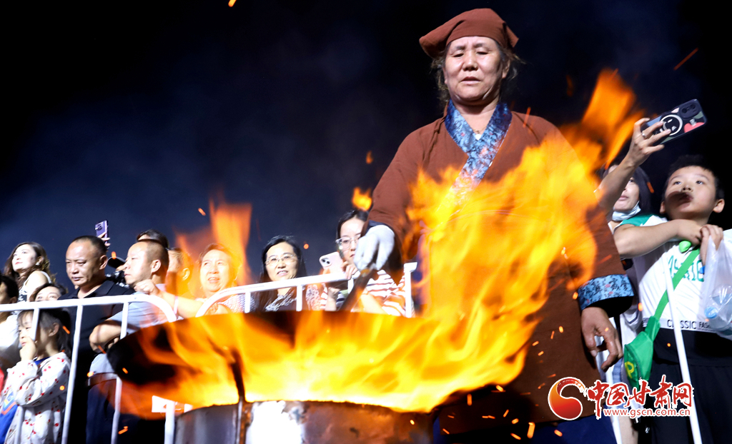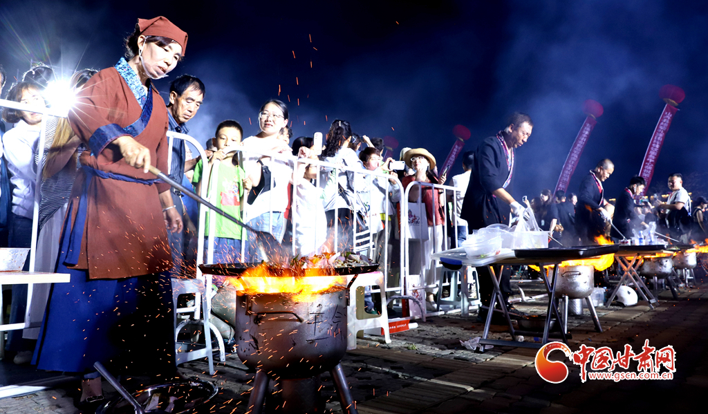 7月13日晚,甘肅省張掖市山丹縣智行廣場上, 一口直徑3.3米的大鏊展現(xiàn)在廣場中央,八名大廚揮動著鏟子奮力翻炒,將一碗碗絲路美食炒撥拉呈現(xiàn)在眾多游客面前。