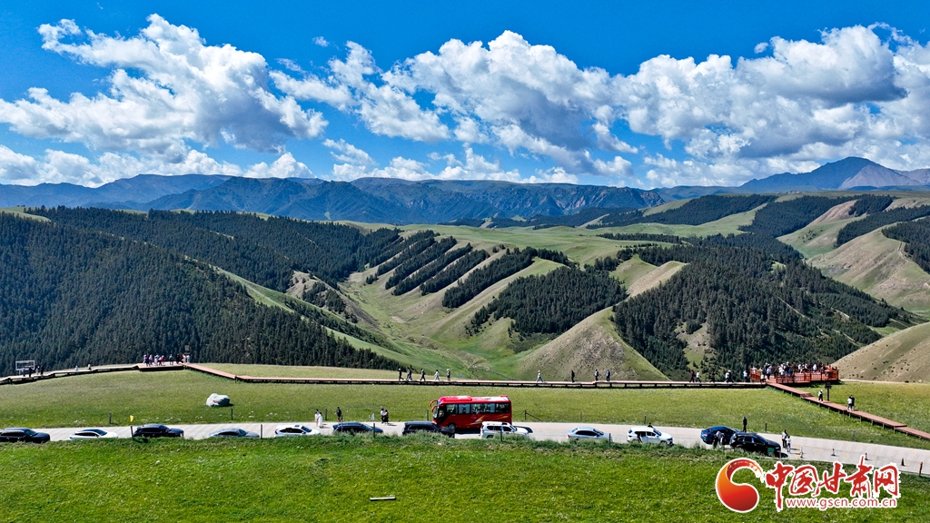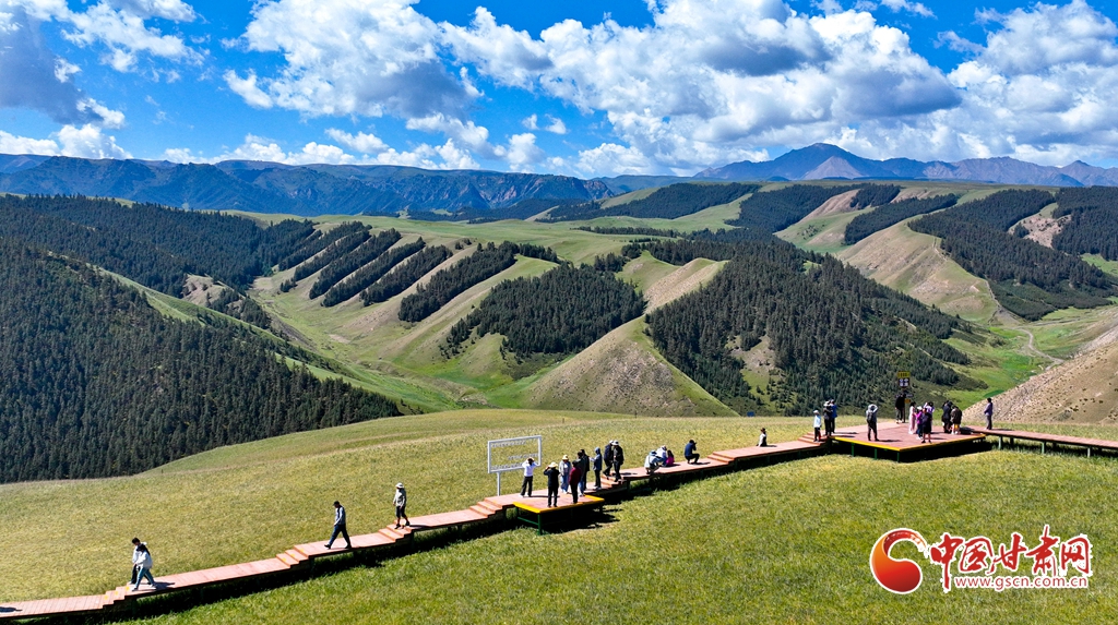 8月3日,祁連山國家公園甘肅省張掖市肅南裕固族自治縣康樂草原段迎來一年最美時光,游客在藍天、白云、森林、草原融為一體的旖旎風光中拍照留念。