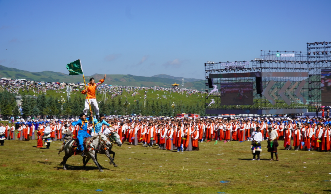 草原騎手乘著矯健的駿馬高舉著鮮艷的五星紅旗從主席臺(tái)前奔馳而過,讓在場的數(shù)萬觀眾贊嘆不已,呈現(xiàn)出一個(gè)絢麗多彩的甘南、和諧穩(wěn)定的甘南、朝氣蓬勃的甘南、包容開放的甘南、團(tuán)結(jié)奮進(jìn)的甘南。
