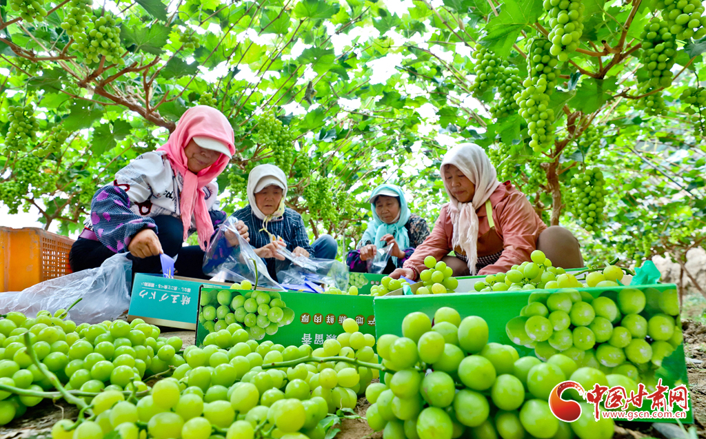 8月28日,在高臺縣南華鎮(zhèn)智號村1000畝陽光玫瑰葡萄綠色標準化產(chǎn)業(yè)園內(nèi),40多萬斤陽光玫瑰進入成熟采摘期,果農(nóng)們正在采摘、分揀、裝箱,準備發(fā)往浙江、江蘇、新疆、青海、內(nèi)蒙古等地客商的手中。