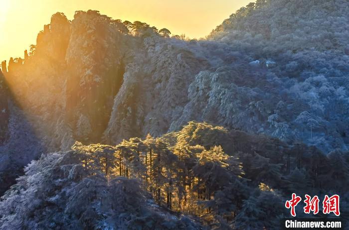 11月26日,黃山風景區(qū)雪后初霽,朝陽照射在山峰上。張寧 攝