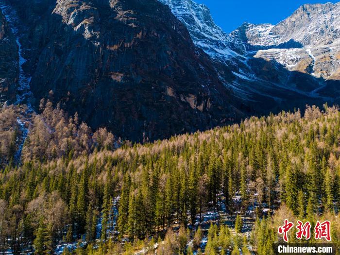 12月2日,四川省阿壩州小金縣四姑娘山雙橋溝,雪山與森林相映生輝。中新社記者 張浪 攝