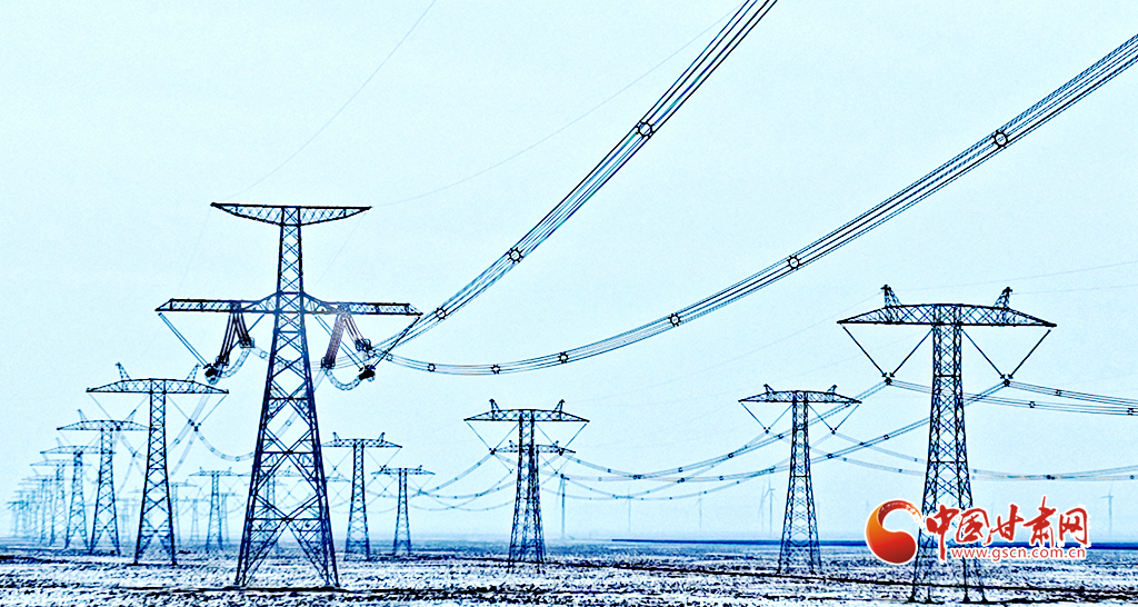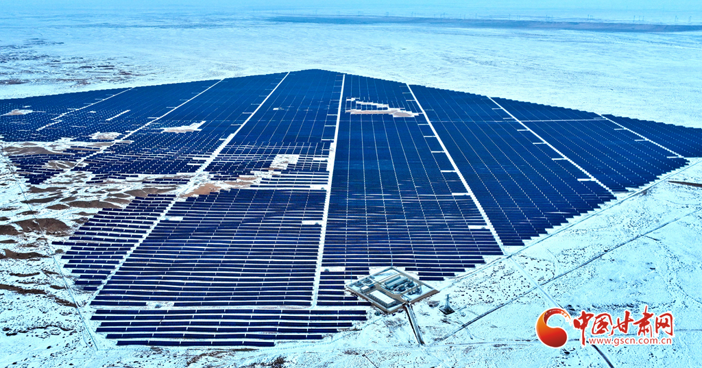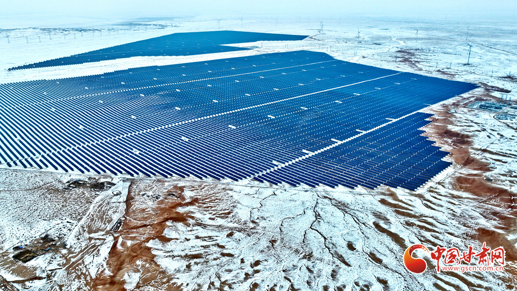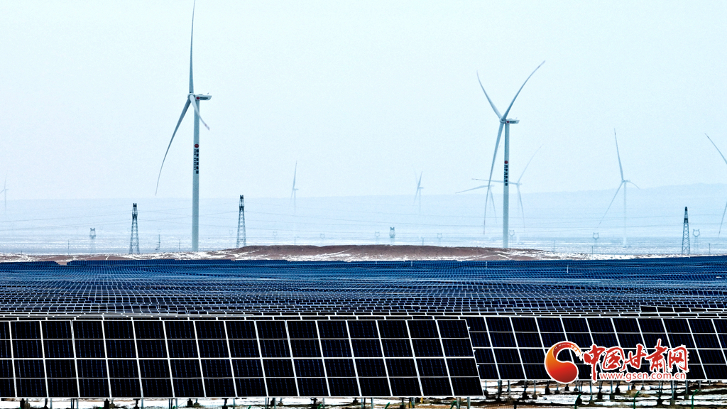 12月18日, 一場(chǎng)大雪過后,大漠深處的張掖市臨澤縣北部灘新能源產(chǎn)業(yè)園內(nèi),81.1萬千瓦光伏治沙光伏集陣和85萬千瓦風(fēng)力發(fā)電機(jī)組群,在防沙治沙的同時(shí)將光熱和風(fēng)力轉(zhuǎn)換為電能輸入國家電網(wǎng),推進(jìn)了“西電東送”輸電工程建設(shè)。