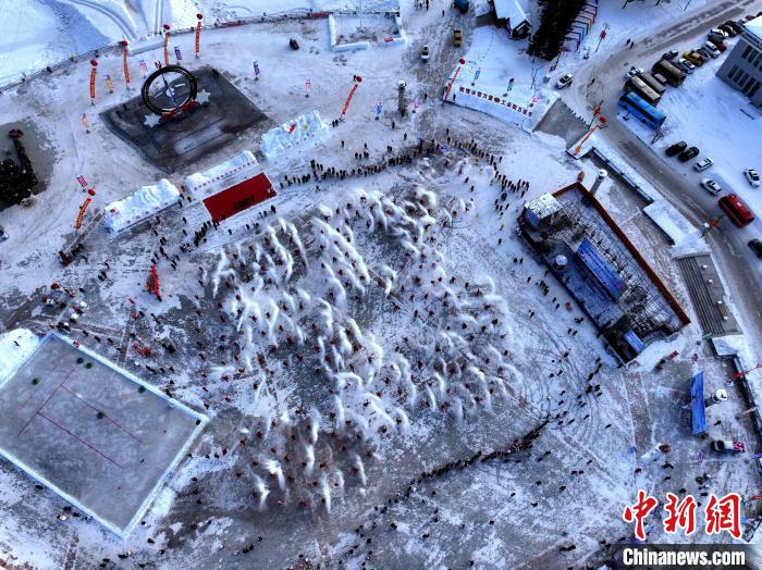 當(dāng)日,北極村七星廣場上,身披紅斗篷、頭戴紅帽子的游客和當(dāng)?shù)鼐用窠M成一個巨大的“53°”造型。伴隨著激情澎湃的音樂,他們擺好姿勢,將手中熱水奮力一灑,齊聲高喊“極致興安嶺 潑出好風(fēng)景”,一道道劃破天際的弧線,碰撞出的神奇光影。震撼的場面讓現(xiàn)場游客驚呼不已,他們紛紛舉起手機定格這個精彩瞬間。