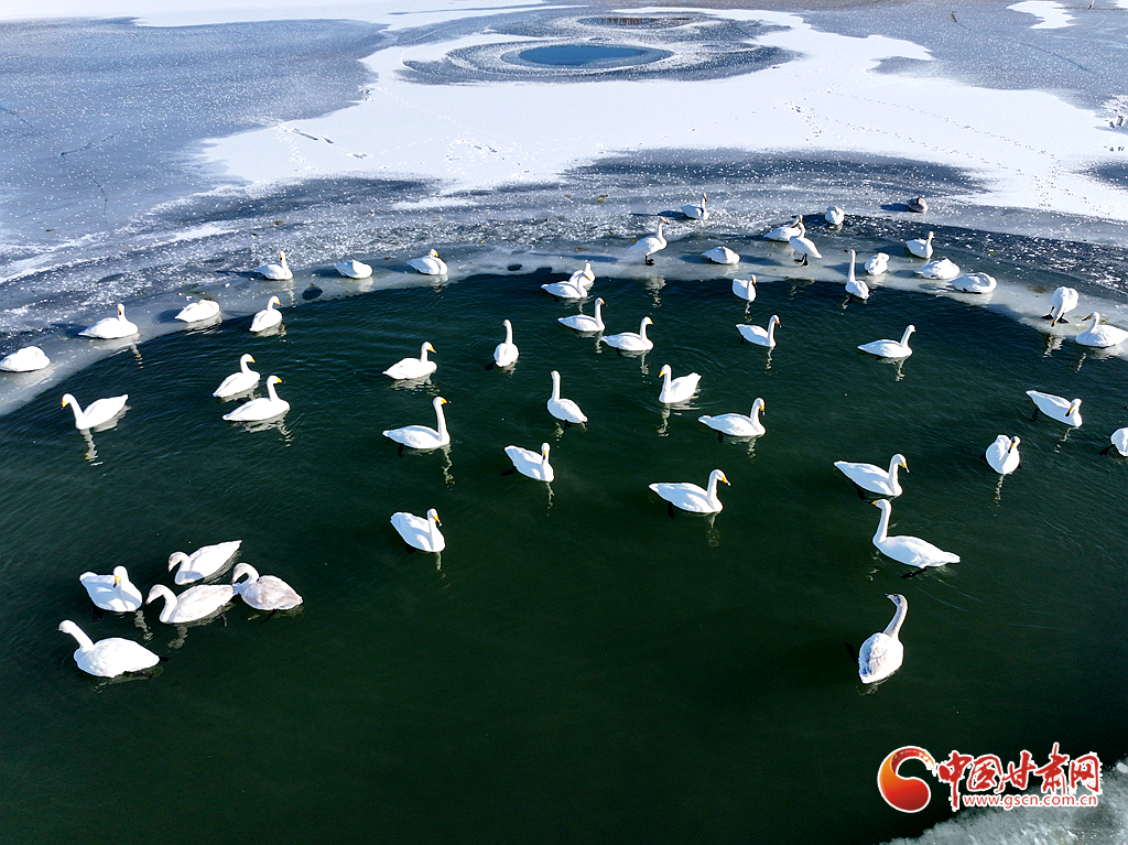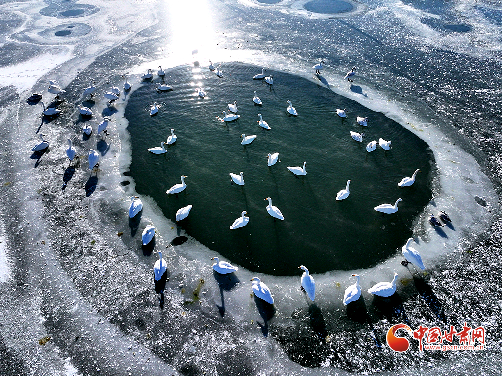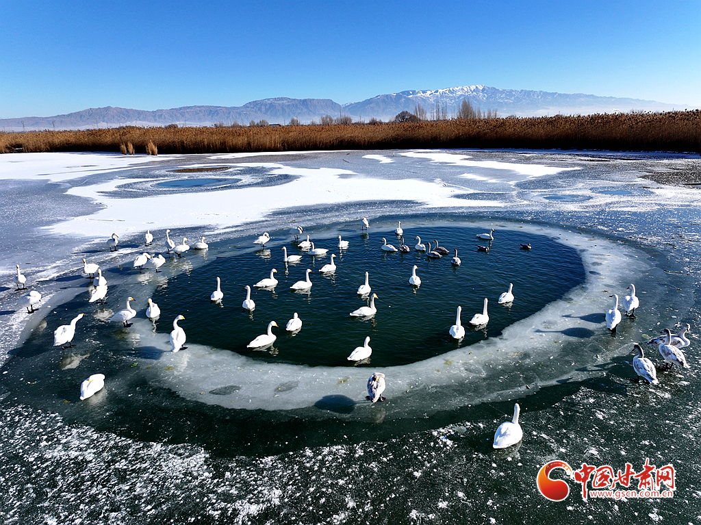 近日,在甘肅省張掖國(guó)家濕地公園,成群的越冬天鵝在冰封的湖面上悠然覓食、嬉戲,構(gòu)成了一幅動(dòng)人的生態(tài)畫卷,成為冬日里一道尤為引人注目的風(fēng)景線。