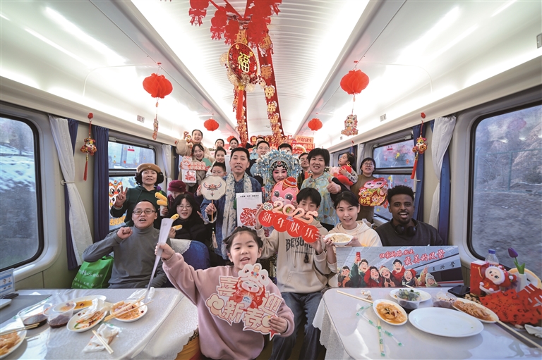 在歌聲、鼓聲、歡笑聲中,出鍋的餃子讓跨年列車的車廂年味更濃,把“春運(yùn)回家”這一樸素而又濃烈的幸福感,通過舌尖味蕾傳遞,把“團(tuán)圓便是年”“回家的路就是最美的風(fēng)景”,通過餃子這一代表著中國人情愫強(qiáng)烈的文化符號(hào),將天南海北奔赴山海的人們團(tuán)聚在列車、歡度在旅途。