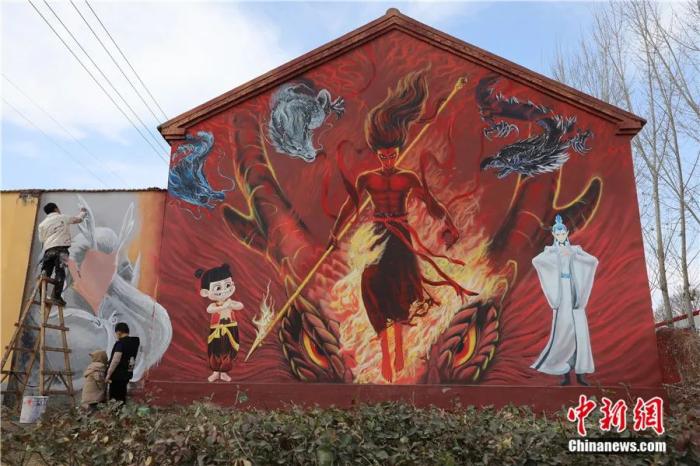 2025年2月12日,山東淄博周村區(qū)沈家村,一幅高10米、寬8米的哪吒墻繪走紅。該墻繪由當(dāng)?shù)?ldquo;90后”墻繪師沈靖宇手繪完成。中新社記者 王采怡 攝