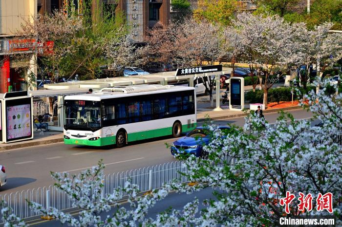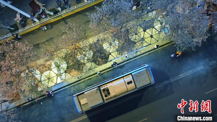 3月26日,被譽為武漢“最美櫻花車站”的珞喻東路大黃村公交站櫻花盛放。經(jīng)過改造的大黃村公交站,新增了自助售貨機、衛(wèi)生間、共享充電寶等便民設施,煥然一新的科技智慧站臺與粉白如霞的櫻花相映生輝。微風吹過,櫻花花瓣浪漫飄零,吸引不少市民游客觀賞“打卡”。圖為公交車在珞喻東路大黃村公交站停留。(無人機照片)劉康 攝