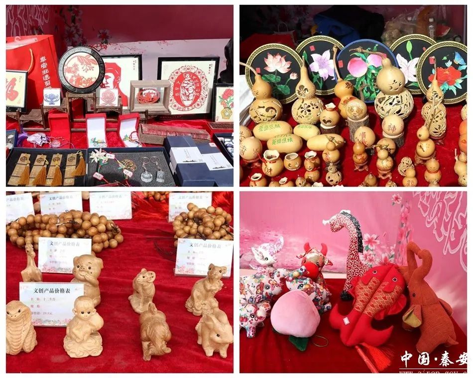 文創(chuàng)攤位前同樣人氣爆棚。精美的桃花折扇、雕花書簽、桃花傘,印著大地灣文化IP“小祖宗”的帆布包,寓意吉祥的桃木雕刻,以及麥稈編、剪紙等非遺手工藝品,每件都承載著秦安文化底蘊。攤主熱情地為顧客介紹產(chǎn)品的來歷與寓意,偶爾還會講述一些背后的創(chuàng)作背景故事,引得大家頻頻點頭稱贊。