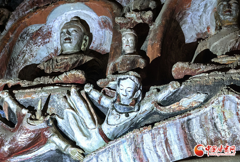 這里最具特色的是東窟一層龕楣兩側(cè)懸塑的飛天,相對作凌空飛舞之勢。金塔寺內(nèi)的高肉雕彩塑飛天歷史遠早于敦煌飛天,屬洞窟藝術(shù)之罕見珍品,為全國僅有。