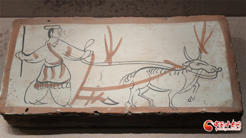 在博物館的“古冢丹青——高臺魏晉十六國時期墓葬壁畫藝術(shù)陳列”展廳里,記者看到,《二牛耕地畫像磚》生動再現(xiàn)了當時的農(nóng)耕技術(shù):兩頭耕牛架著直轅犁,后隨的男子一手扶犁一手揚鞭,展現(xiàn)了典型的“二牛抬杠”耕作方式?!赌谅箞D壁畫磚》則描繪了古人放牧鹿群的獨特場景,為研究當時的畜牧業(yè)發(fā)展提供了珍貴資料。