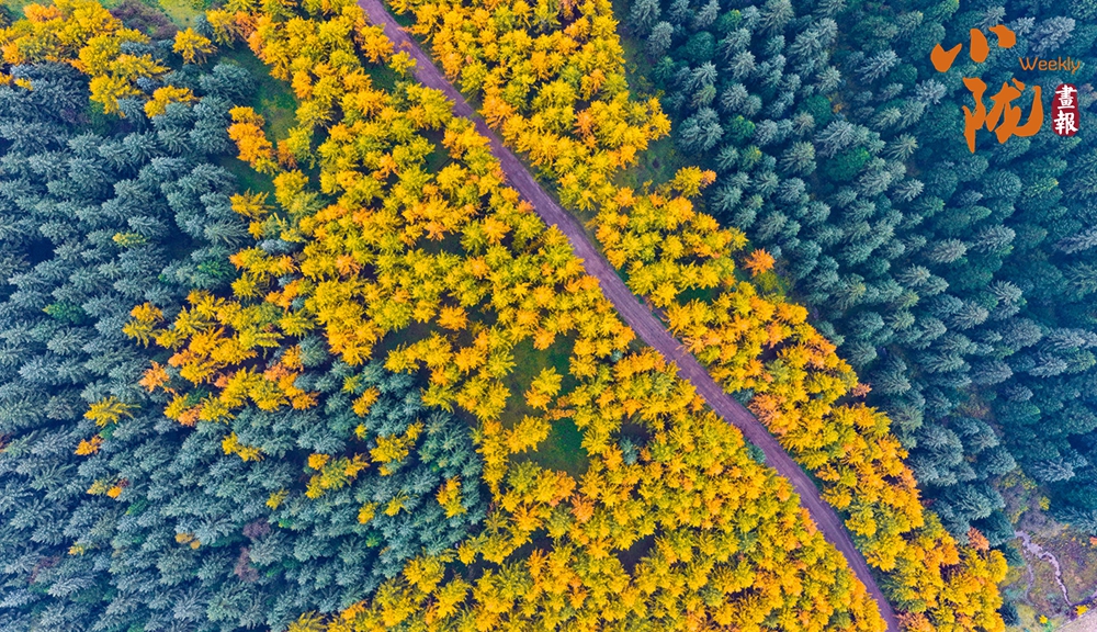 兩種顏色的樹木交錯而立,楓葉黃得像錦緞,而松針依舊蒼翠,兩種樹木在風中輕輕搖曳,仿佛在跳一支無聲的舞。這一片片斑斕奪目的色彩,是對這個初冬最徹底的詮釋。