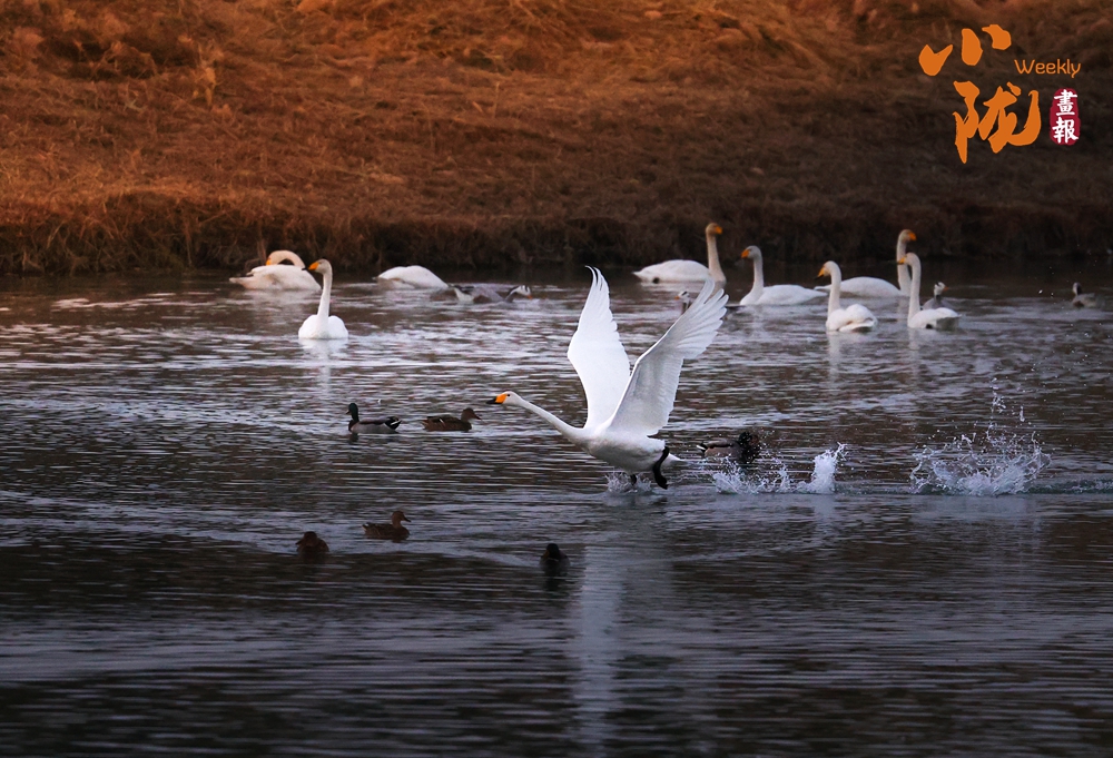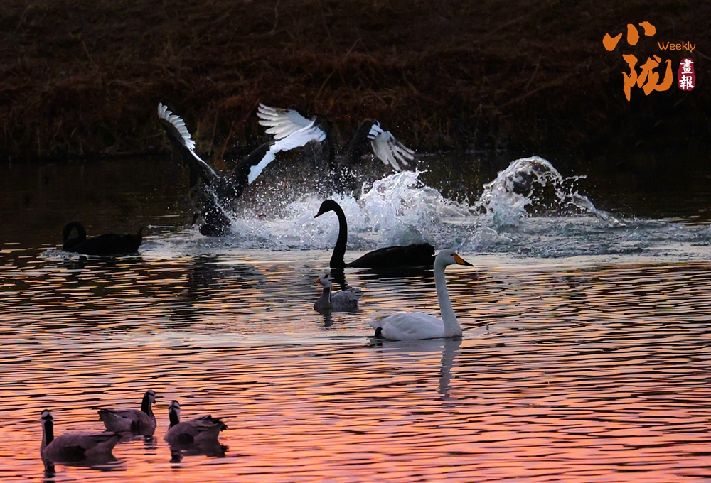 這里聚集了黑鸛、白鷺、鴛鴦、天鵝、赤麻鴨、灰雁等多種水鳥,它們在黃昏里愜意地游弋,或扎進(jìn)水里捕魚,或相互追逐戲水的畫面,既震撼又溫柔,成為攝影愛好者和游人爭相追逐的“冬日奇景”。